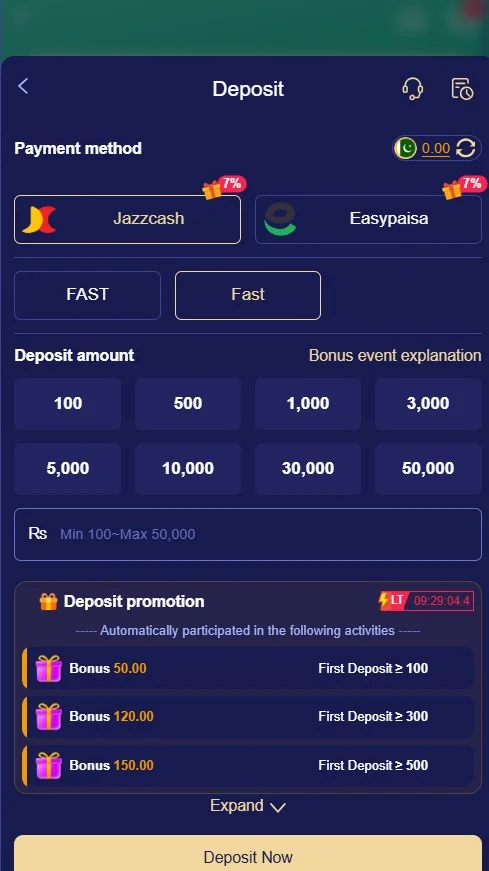 Depositing an amount on this app is very simple. You can find a deposit button at the top of the main menu, tap on it, and select a payment method. All methods are locally optimized for Pakistani users and work fast.